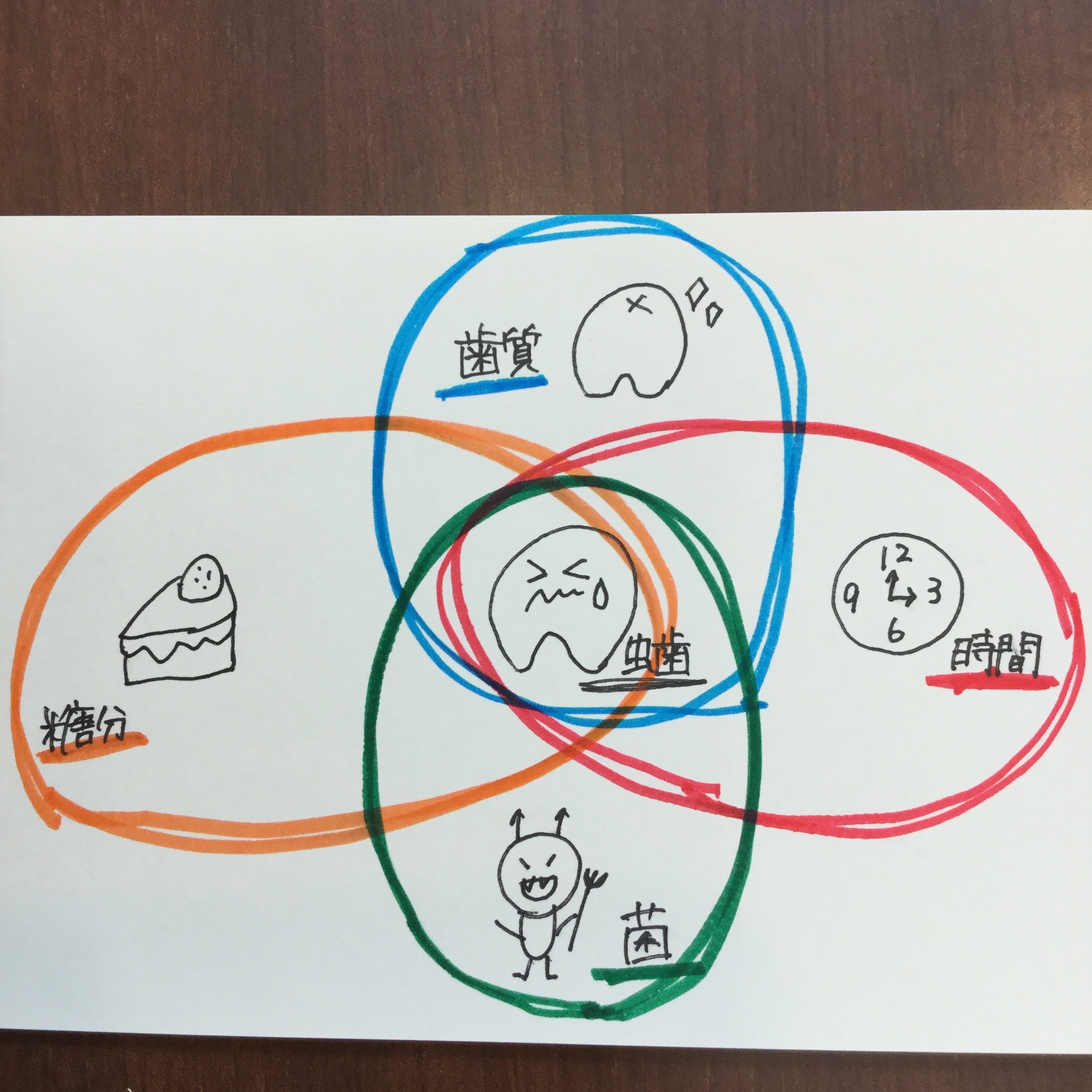 下のイラストのように4つの輪が重複した際にむし歯ができるのです…