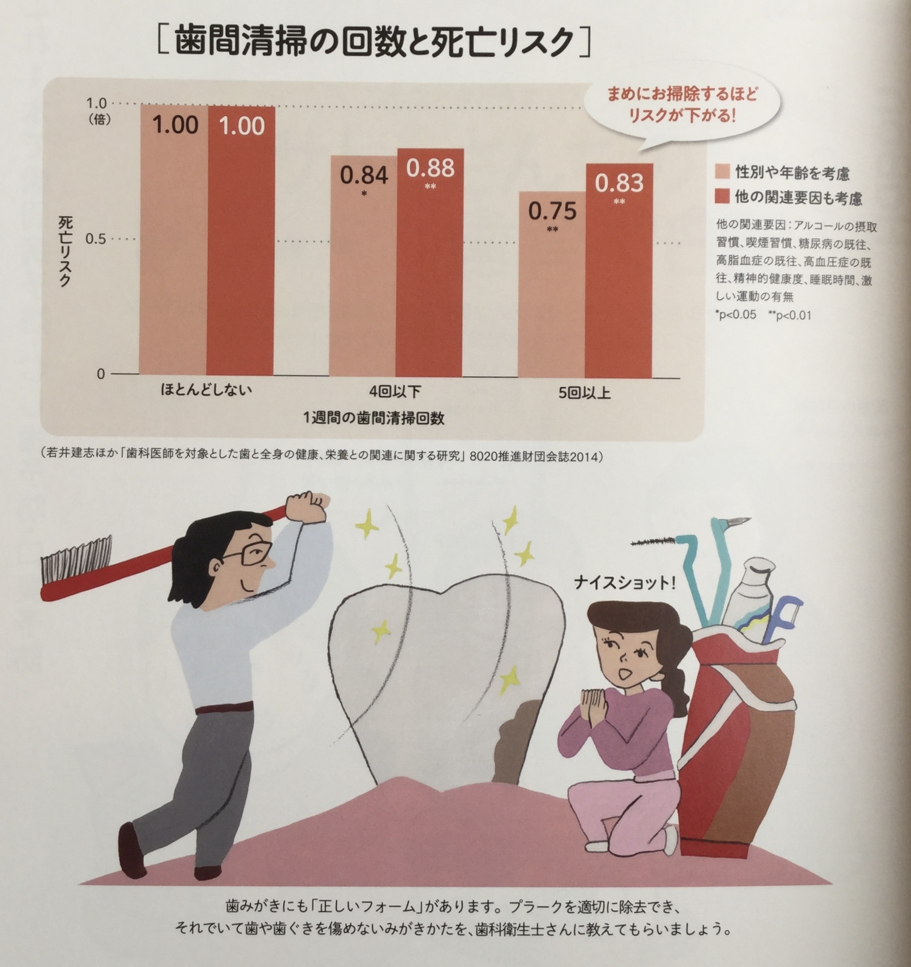 「ほとんどしない」人を1とすると、歯間清掃を週に5回以上している人は死亡リスクが7〜8割に下がっています。