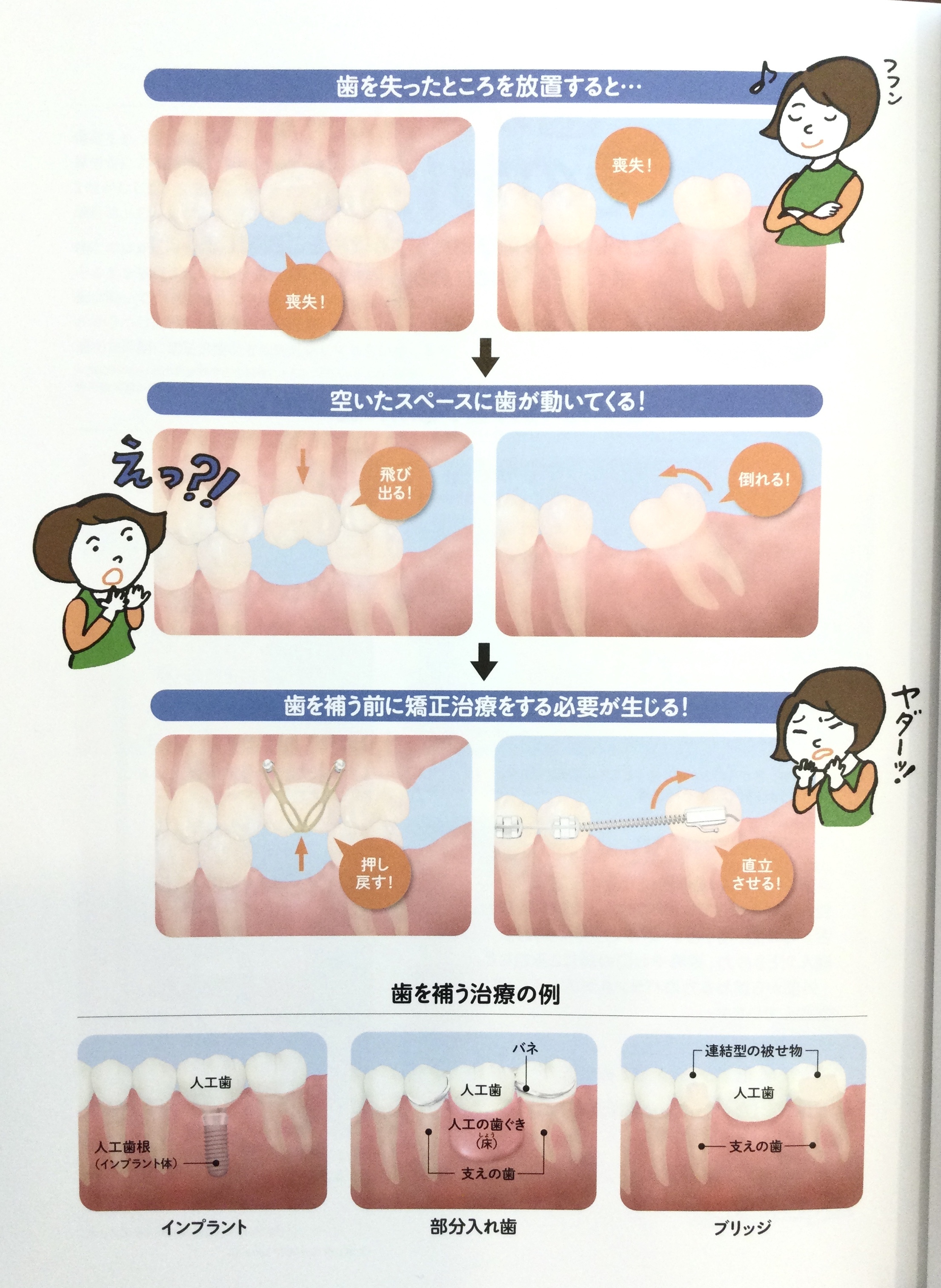 長い間、そうして放置していると、歯がなくなった場所にまわりの歯が倒れてきたり飛び出したりしていざ部分入れ歯やブリッジ、インプラントを入れようとしたときに、動いてきた歯が邪魔で入れ歯やインプラントが入れられず、まずは歯を元の位置に戻す矯正治療が必要になってしまうことがあるのです。