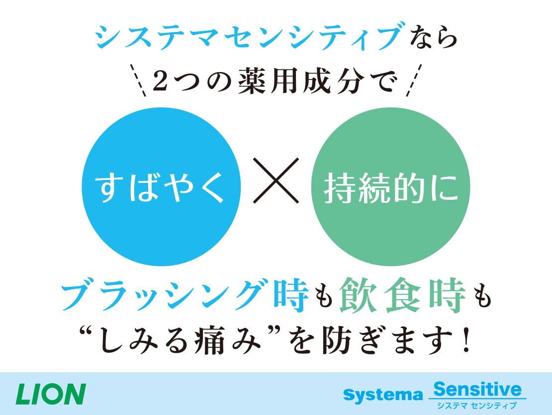 システマセンシティブに配合されている「硝酸カリウム」は、歯の神経に刺激が伝わるのを抑えます。使用したその日から知覚過敏の症状の改善が期待できるのです。(個人差があります)もうひとつの配合成分である「乳酸アルミニウム」は、歯の神経が分布している象牙質の細かい穴を塞ぐことで、外からの刺激を遮断できます。この効果はシステマセンシティブを継続して使っていく中で発揮されていくことでしょう。