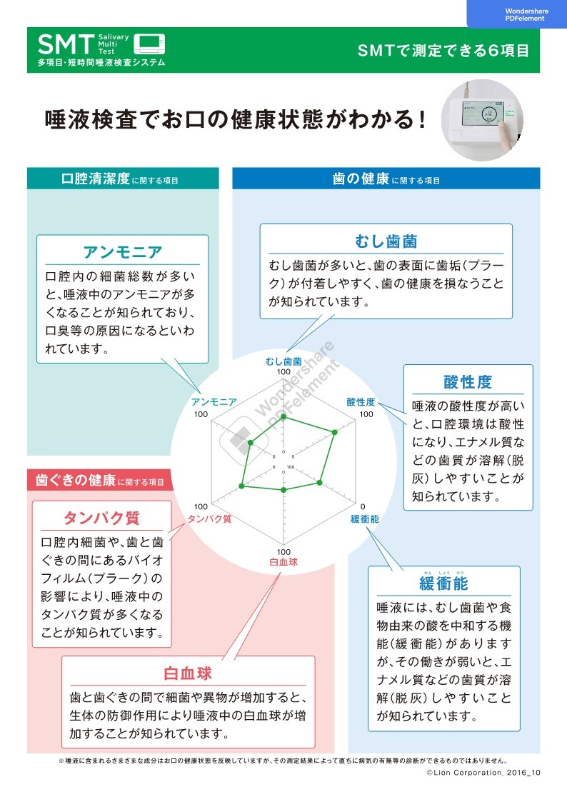 菅原歯科医院では、SMT(Salivary Multi Test)という唾液検査に対応しております。唾液を少量、採取するだけでお口の健康状態が詳細にわかる検査となっており、可能であればすべての患者さまに受けていただきたいと考えております。今回はそんなLIONが開発・提供している唾液検査について、わかりやすく解説をします。